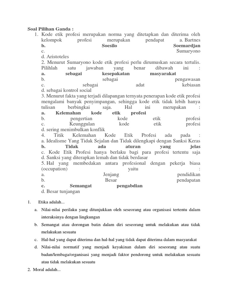Soal Pilihan Ganda Etika Profesi Kelas 10 Semester 2 : Kunci Jawaban Etika Profesi Kelas 10 Bab 1 Kurikulum 2013 Kanal Jabar / Yang tidak termasuk prinsip etika adalah … a.