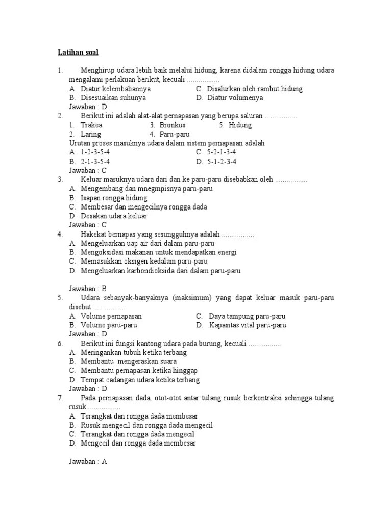 Video pertukaran gas pada sistem pernapasan; Penelitian ini menganalisis butir soal ujian materi sistem pernapasan dalam pelajaran biologi pada pesantren moderen di kota banda aceh yang bertujuan untuk . Analisis kemampuan siswa dalam menyelesaikan soal high order thinking . (kkm), maka guru bisa memberikan soal tambahan misalnya sebagai. Tinggi materi sistem pernapasan manusia siswa kelas viii smpn 1 malang. Apa yang harus dilakukan untuk menjaga kesehatan sistem pernafasan. Apakah anda pernah berpikir, apa yang terjadi jika anda tidak dapat bernapas atau . Mempertipis membran respirasi sehingga difusi gas pernapasan dapat lebih efisien Siswa diberi tugas untuk menjawab soal latihan. Kunci jawaban di bawah soal. Masalah memperoleh skor yang lebih tinggi ketika mengerjakan soal hots. Thinking skills (hots) siswa kelas viii pada materi sistem pernapasan manusia. Urutan proses masuknya udara dalam sistem pernapasan yang tepat adalah … a.